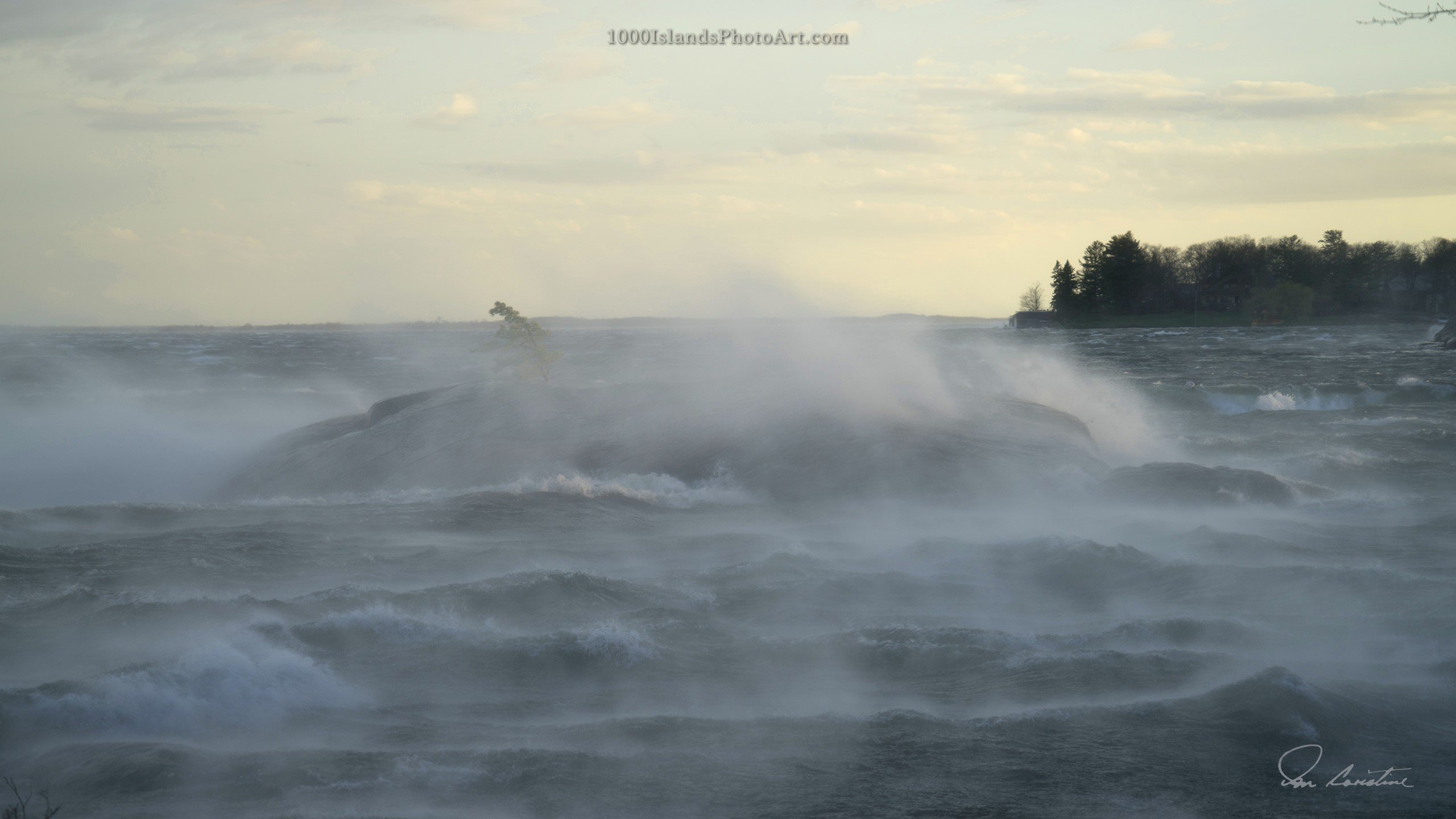 I also have shots of a couple of other memorable moments, though not good enough to share. One shows the waves blown into round rollers, no whitecaps, with a small tree a blur as the branches were thrashed. Within seconds the wind had switched from a wild westerly to an even wilder northerly, all over and done in a minute. One of our stately pines barely survived as its roots were stretched out of cracks in the rock, but somehow it held. Others on shore were snapped like twigs. A small tornado, and I’m quite certain that my shot was taken in the middle of it.